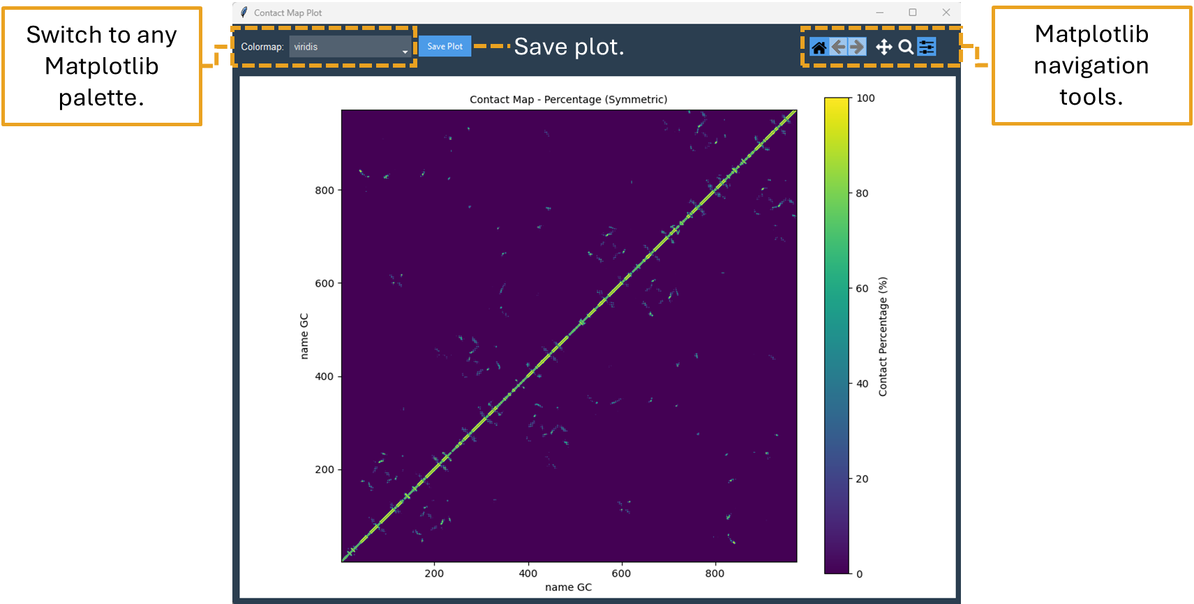 The contact map heatmap utilizes data from all contacts within the specified cutoff to compute an average residue-by-residue persistence duration of the contacts in the trajectory. Based on the selection, several beads or atoms of a single residue may interact with numerous beads or atoms of another residue; therefore, to eliminate repetition, only the interacting pair with the highest frame count is utilized in the plot. However, a file with the information of all the interacting pairs is created to be used by the user. In addition, a standard Matplotlib navigation (pan/zoom) is presented, showcasing various accessible color combinations.