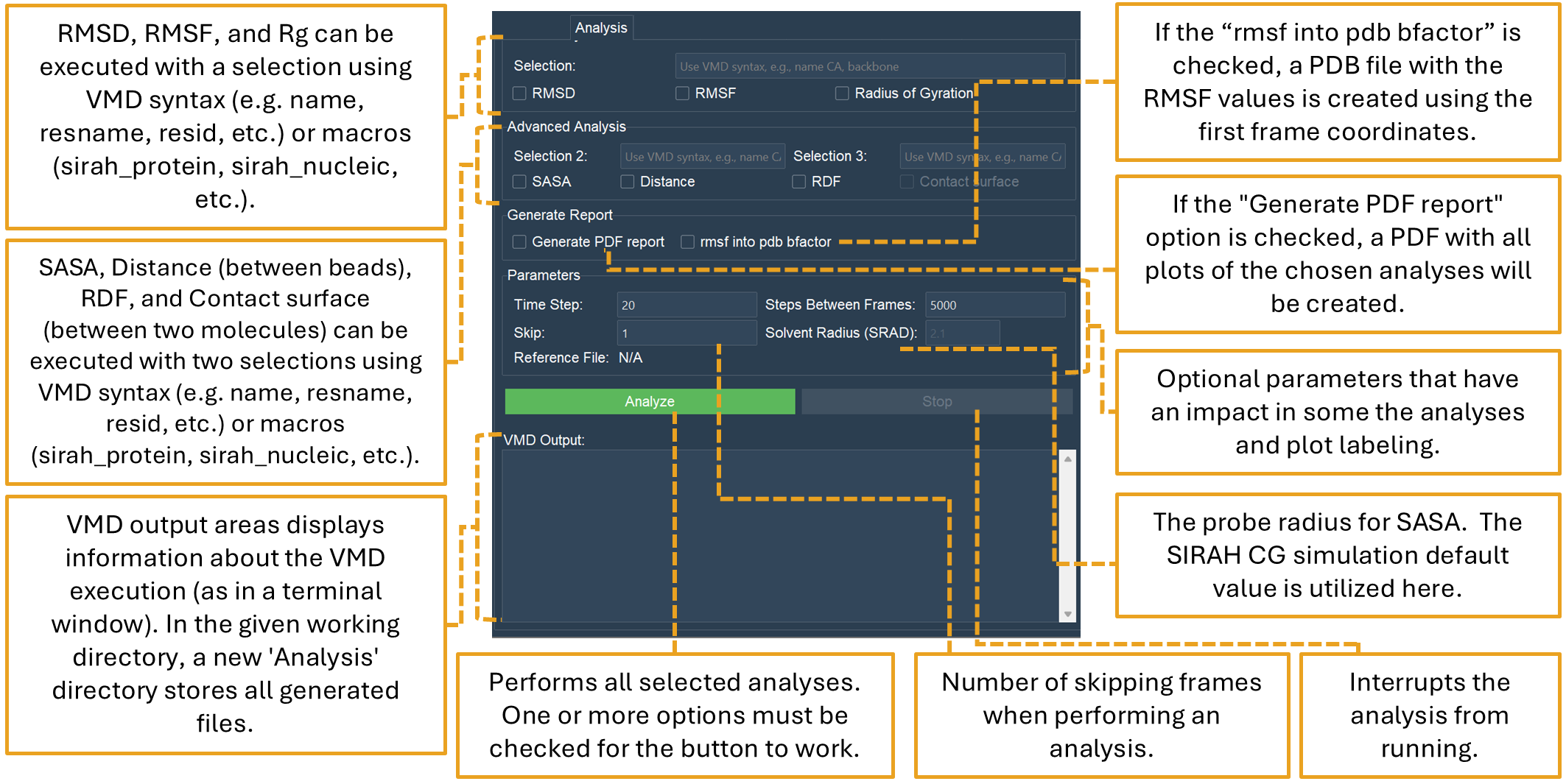 Here let’s select the Analysis tab. This tab allows several types of MD simulation analysis using VMD syntax selections (e.g. name, resname, resid, etc.) or VMD macros. See more details of the tab here.