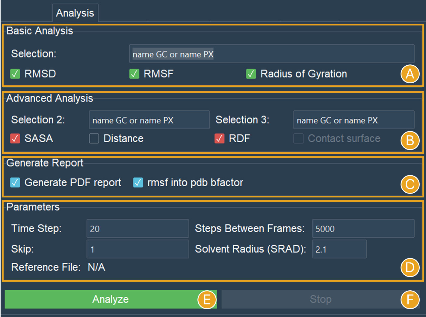 Figure 5. Analysis tab settings for analyses using “name GC or name PX” beads. A) Basic Analysis selection for the NCP system. B) Advanced Analysis selection for the NCP system. C) Selected options in the “Generate Report” section. D) No reference structure was imported, and the options “Time step” and “Step between frames” were set to the default values. However, a 10 frame skip was used. E) The “Analyze” button will perform all the selected actions. F) Only when an analysis is underway is the “Stop” button activated, and pressing it will halt the analysis’s progress.